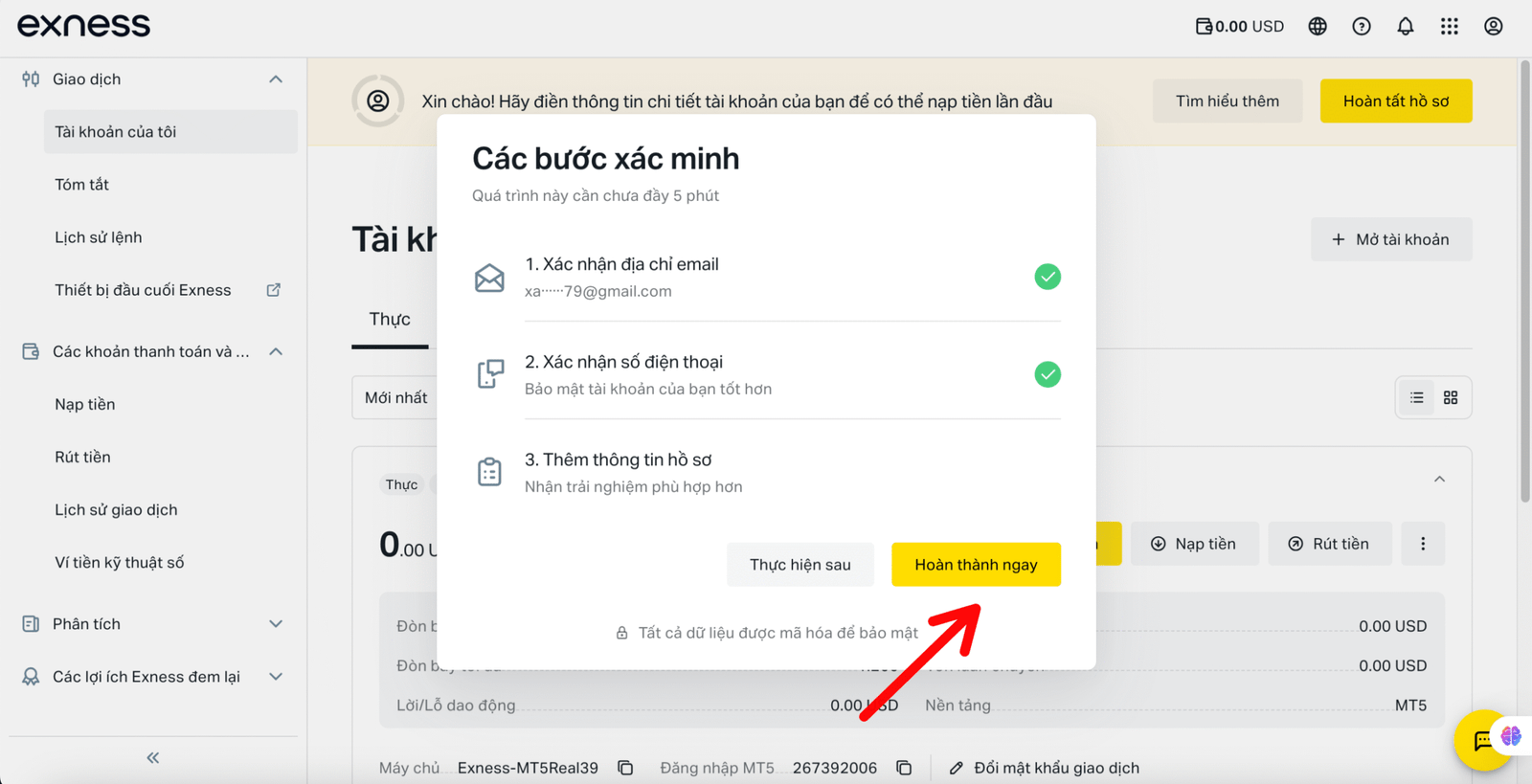 Sau khi đăng ký thành công, bạn sẽ được chuyển đến Dashboard. Nhấn Hoàn tất hồ sơ để xác minh tài khoản Exnessvà đảm bảo bảo mật.