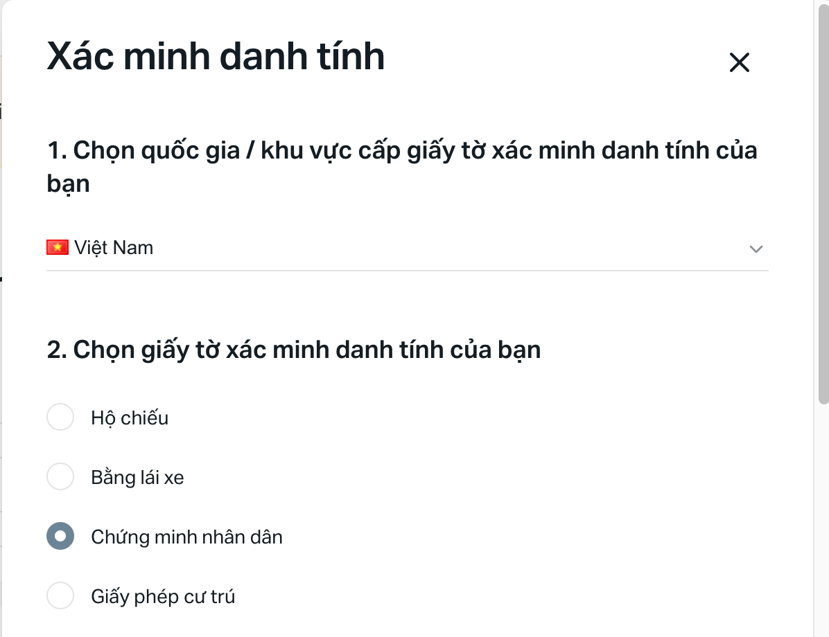 Tải lên tài liệu: ở bước này bạn có thể chọn hộ chiếu, bằng lái xe, hoặc căn cước công dân.